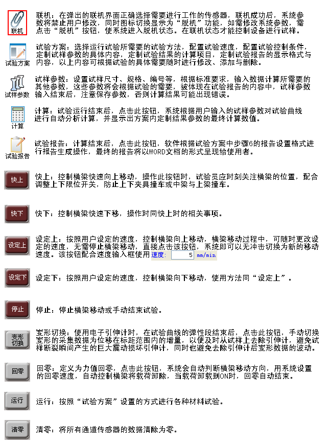 檢查限位開關位置是否正確設置-----打開設備電源---確認設備電源指示燈已亮起---打開測控軟件----點擊聯機----確認聯機成功----開始試驗
