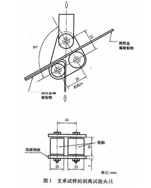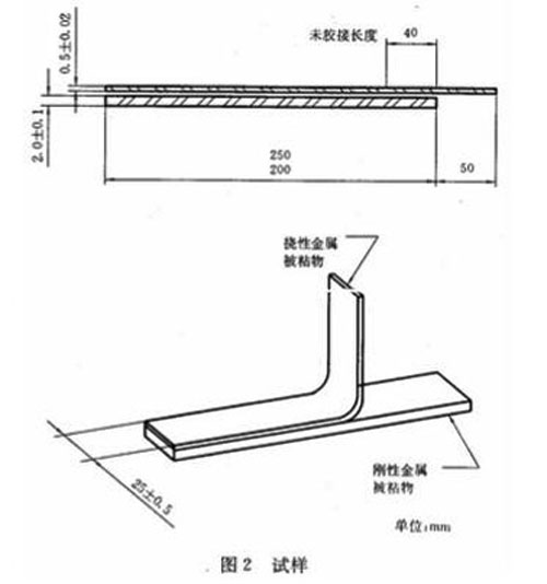 剝離強(qiáng)度:在規(guī)定的試驗(yàn)條件下,測量兩個(gè)相互膠接的金屬被粘物的試樣沿著膠接線逐漸分離的單位寬度上所需的平均力,以 kN/m表示。